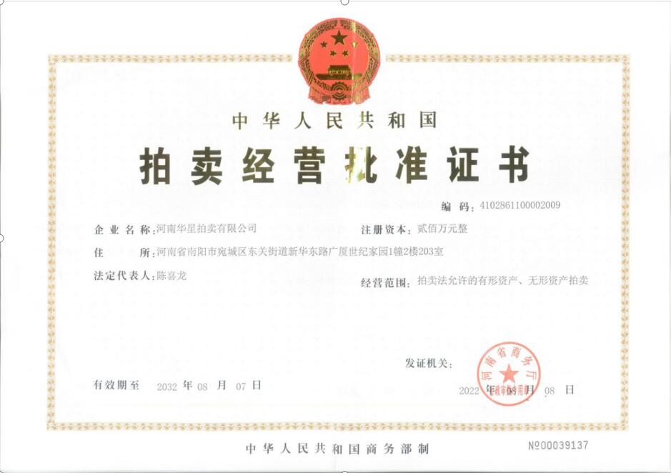 河南華星拍賣有限公司是經河南省商務廳批準,南陽市工商行政管理局依法注冊登記的綜合性拍賣機構。公司成立于2009年8月,注冊資金100萬元人民幣,經濟性質為有限責任公司,2013年7月取得由河南省財政廳頒發的“河南省公物拍賣資格證書”,F為河南省拍賣行業協會會員單位,中國拍賣行業協會會員單位,南陽市財政局中標單位,唐河縣財政局中標單位。南陽市農業銀行中標單位,鄧州市機關事務管理局中標單位、鎮平縣礦山修復廢礦產處置拍賣機構(唯一中標)。 本公司的業務范圍為:行政執法機關依法處理物品,充抵稅款的物品;審判機關依法處理的物品,充抵罰金、罰款的物品,無法返還的追回物品;檢察機關依法追回的物品;航運、郵政、公路等部門獲得的需處理的物品;金融部門需處理的借款抵押財產,保險公司理賠后需處理的損余物品;國家機關、事業單位和國有企業按有關規定需要處理的財產及需要變賣的公物;國家機關工作人員在公務交往和外事活動中接受的按規定需要交公處理的物品;其他方面需要處理的國有資產,如國有資源、房地產、設備、攤亭、營運線路的經營權,國有土地、吉利號碼的使用權,街道、路橋冠名權,新聞媒體和公用設施廣告的發布權等。公司現有國家注冊拍賣師4名,會計師1名,律師1名,具有拍賣從業資格的專職人員3名,具有業務人員數名。 本公司嚴格按照《拍賣法》的規定程序,規范運作,受到委托單位及競買人的充分肯定,為競買人及委托單位創造一個互惠互利、共同發展的良好平臺,贏得了社會的廣泛信譽。